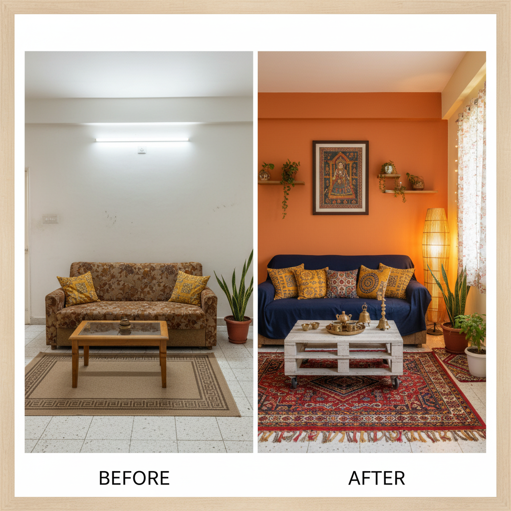 Behomly suggested small but high-impact changes: hanging fairy lights, adding thrifted planters, rearranging furniture for better flow, and painting just one accent wall. Within a weekend and under ₹12,000, the flat looked brighter, warmer, and way more ‘him’.