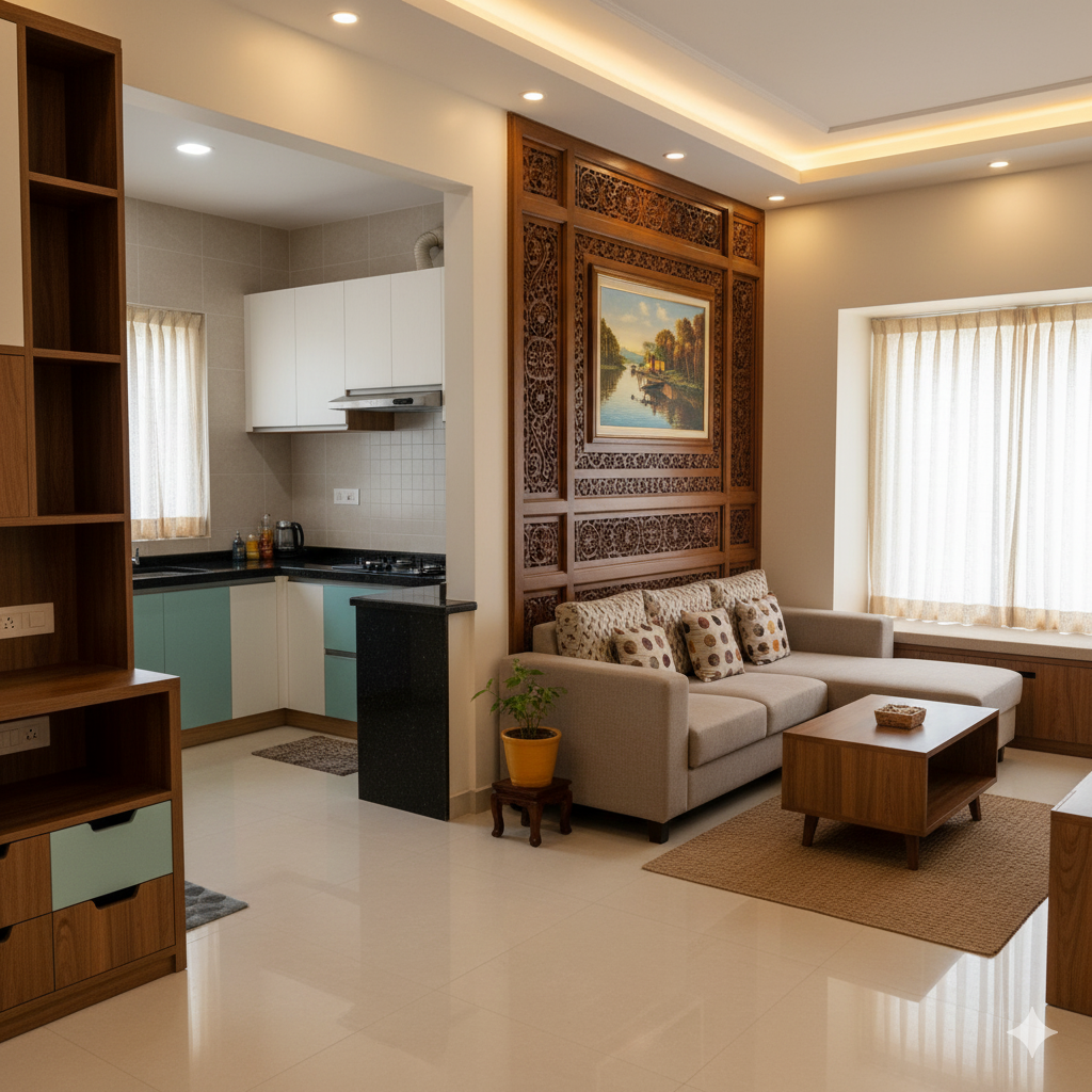 Mr. and Mrs. Nair in Thane wanted Kerala-style wood paneling, modular kitchen in budget, and Vaastu compliance. We divided their ₹8 lakh budget smartly between ready furniture + custom elements + clever storage tricks.