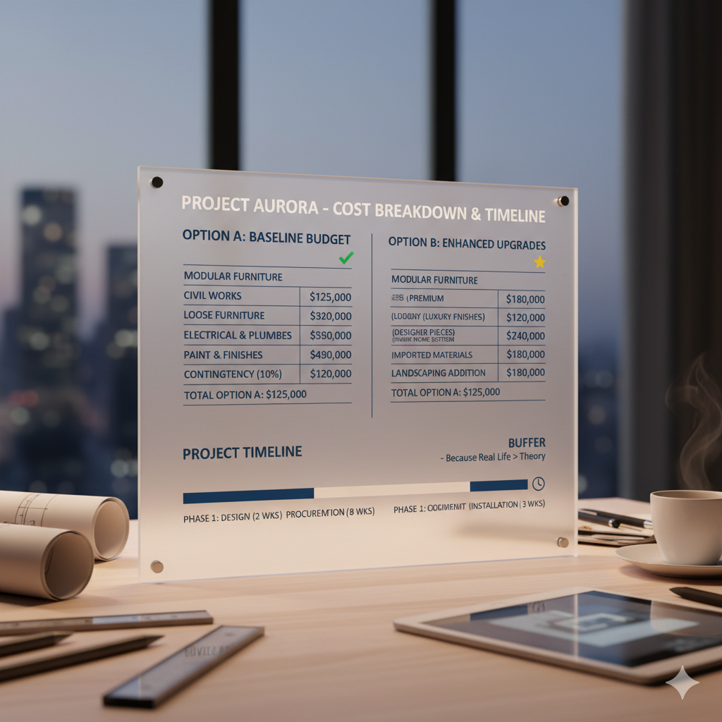 - Transparent cost breakdown (modular, civil, loose furniture, etc.)