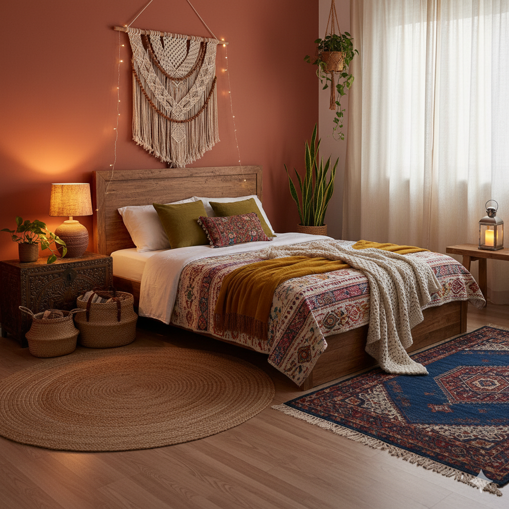 Boho isn’t about perfection—it’s about personality. Pair a cane or rattan headboard with a vintage wooden bedside table. Mix modern pieces with thrifted finds from local markets.