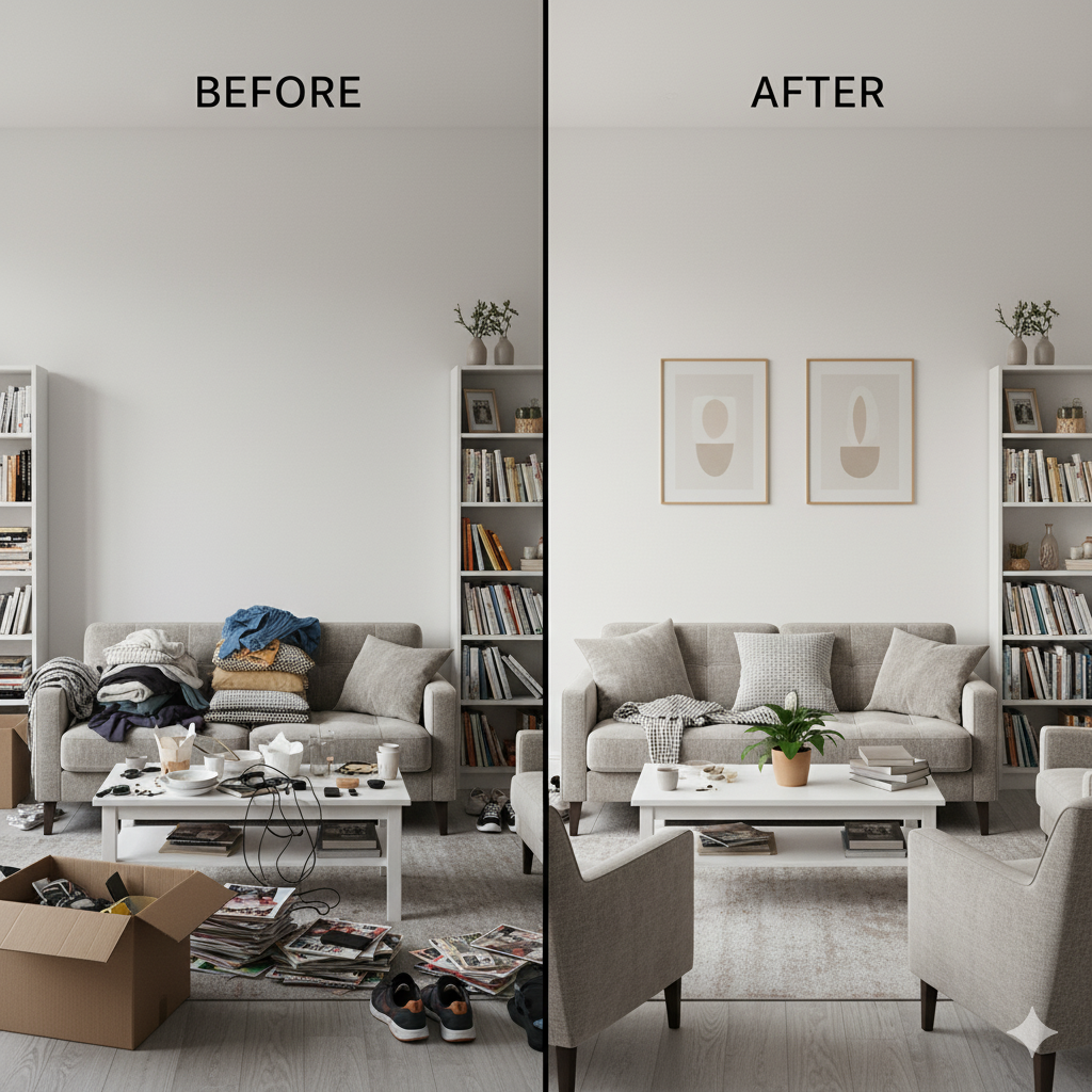 - Decluttering and Rearranging: She started by decluttering and repositioning her existing furniture to improve flow and space.