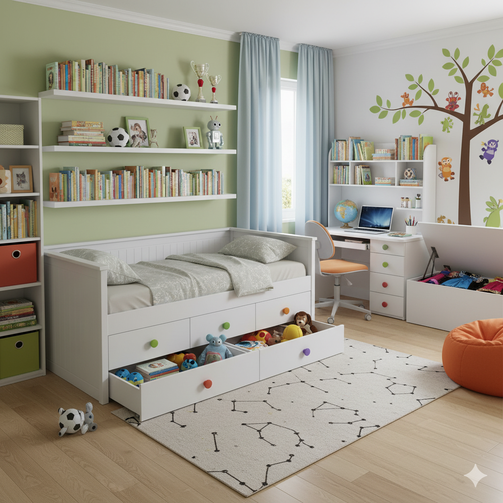 - Under-Bed Storage: Incorporate pull-out drawers or storage boxes beneath the bed to store toys, books, or seasonal clothing.
