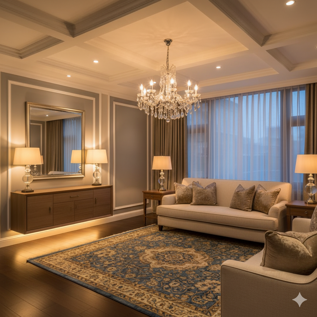 - Statement Chandeliers: A classic crystal chandelier or a modern pendant light adds grandeur.