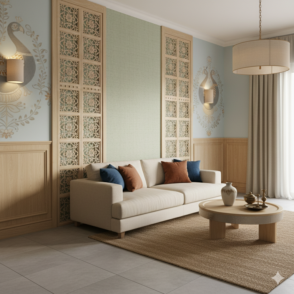 - Traditional Indian Touch: Incorporate jaali patterns, Madhubani art, or hand-painted murals for an indigenous charm.