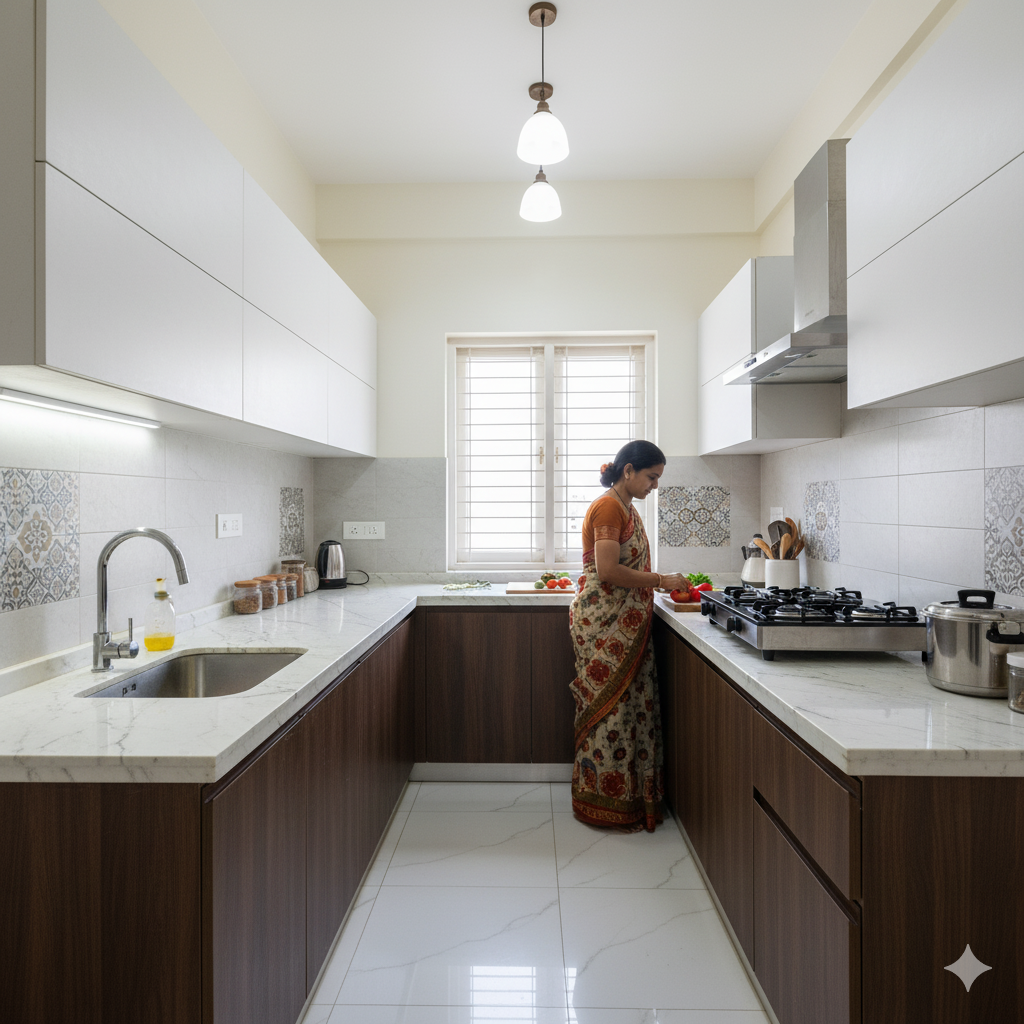 A parallel kitchen has two countertops facing each other, creating an efficient work zone. This layout is commonly found in urban Indian homes due to space constraints.