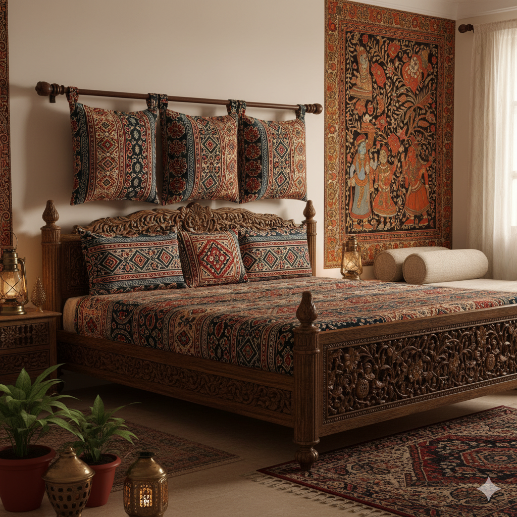 The Behomly Solution: We advised him on a DIY textile headboard. Instead of expensive upholstery, Mr. Verma purchased a stunning, hand-block printed Dhurrie rug from Rajasthan a piece of authentic regional decor. He stretched this vibrant, geometric textile over a padded MDF board that was wider than his bed. The board was then fixed discreetly to the wall. The rich texture and bold, cultural pattern immediately turned a plain wall into the room’s dominant, luxurious focal point. This single project provided a custom, designer look for a fraction of the cost of a pre-made upholstered headboard. It simultaneously honoured Indian craftsmanship and delivered a globally modern aesthetic.