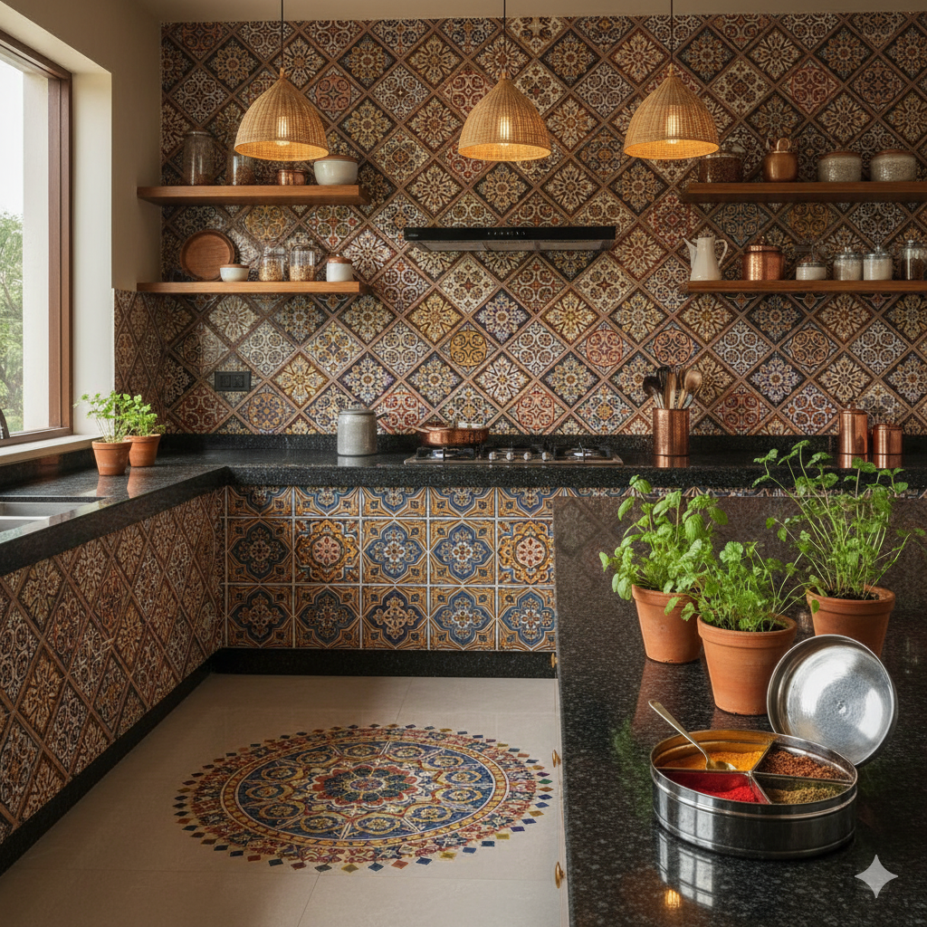 - Geometric or ethnic backsplash tiles for a cultural vibe.