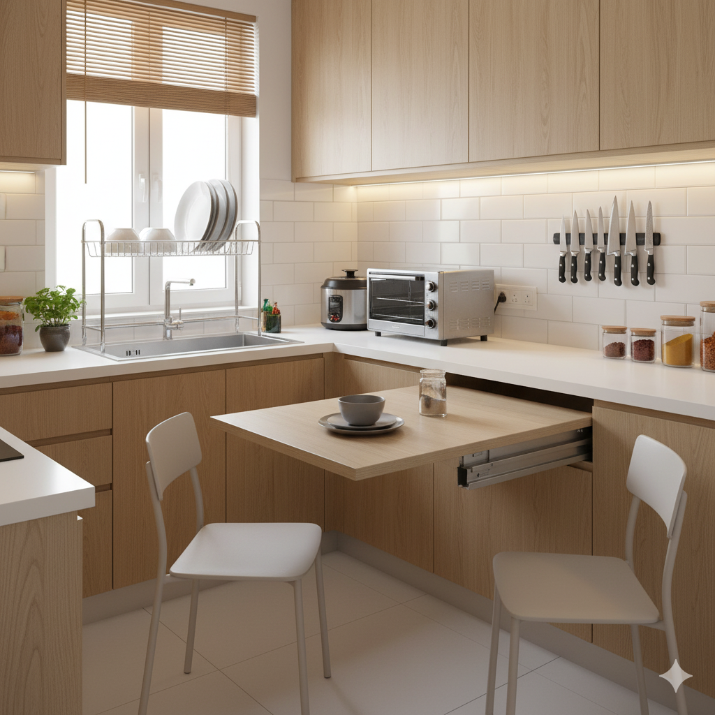 - Foldable dining tables or breakfast counters for space-saving dining.