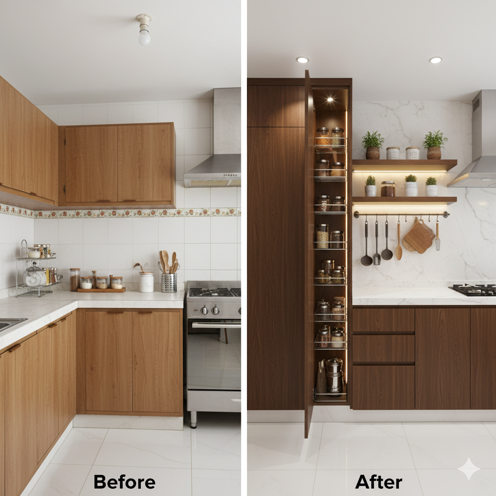- Pull-Out Pantry: A slim pull-out rack for masalas and dry groceries keeps everything within reach.