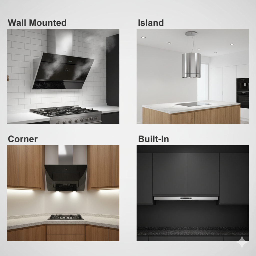 Wall-mounted suits most Indian kitchens with counters against the wall. Island models suit open kitchens with the hob placed centrally. Built-in chimneys suit compact modular kitchens where a seamless look is preferred.